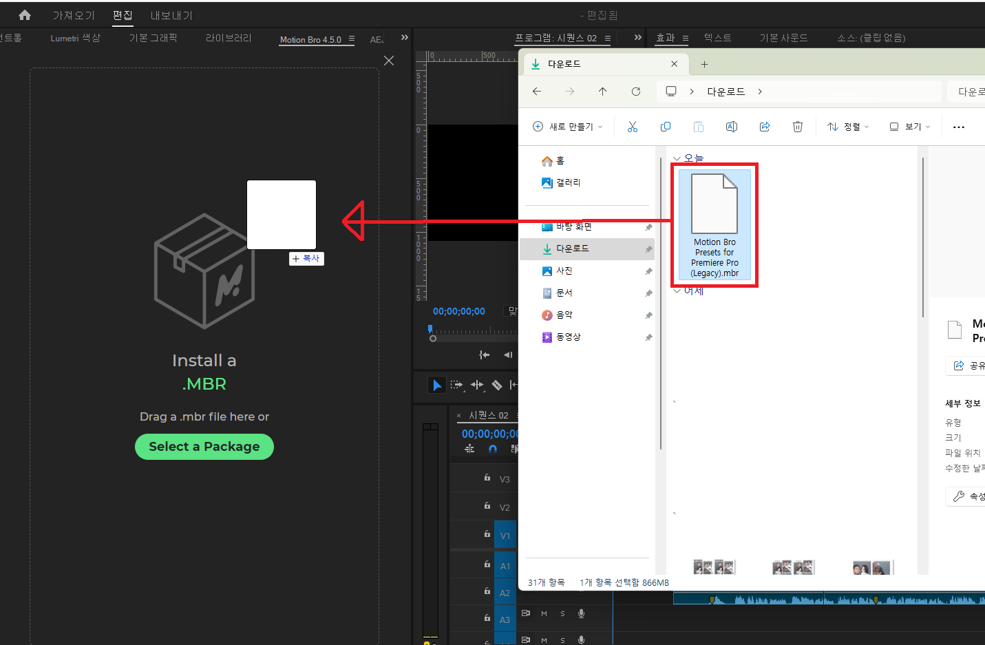 위의 방법과 동일하게 파일을 프리미어프로 모션브로에 끌어와 설치를 해주시면 됩니다.